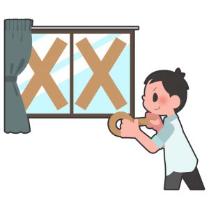 雨戸やシャッターがない場合は、ダンボールや養生テープ、あるいはガラス用の防犯シートを張って、ガラスが割れても飛散しないように工夫しましょう。