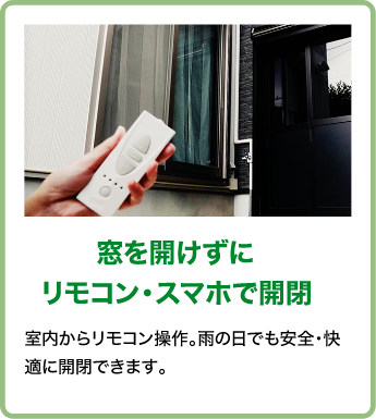 室内からリモコン操作。雨の日でも安全・快適に開閉できます。