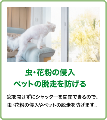 窓を開けずにシャッターを開閉できるので、虫・花粉の侵入やペットの脱走を防げます。