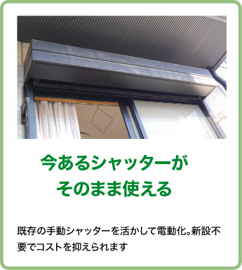 既存の手動シャッターを活かして電動化。新設不要でコストを抑えられます