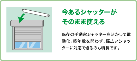 既存の手動窓シャッターを活かして電動化。築年数を問わず、幅広いシャッターに対応できるのも特徴です。
