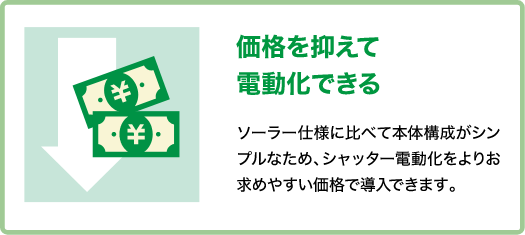 ソーラー仕様に比べて本体構成がシンプルなため、シャッター電動化をよりお求めやすい価格で購入できます。