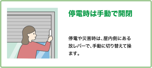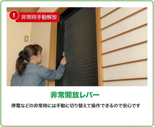 停電や災害時は、屋内側にある非常時解放レバーで、手動に切り替えて操ます。
